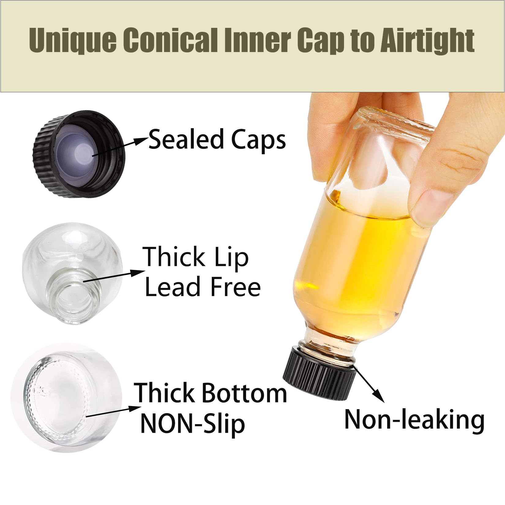 - 【Uniquely Designed Glass Vials】Improvements on the bottle caps makes them seal seamlessly with the bottles, The Conical Inner Cap Tightly Adheres to the Bottle Mouth to Ensure Air Tight Seal. Whether they are carried with you or in your pantry, no need to worry about liquid leaking out and making a mess. Clear thick bottles bottom have non-slip design, prevent accidental slips.