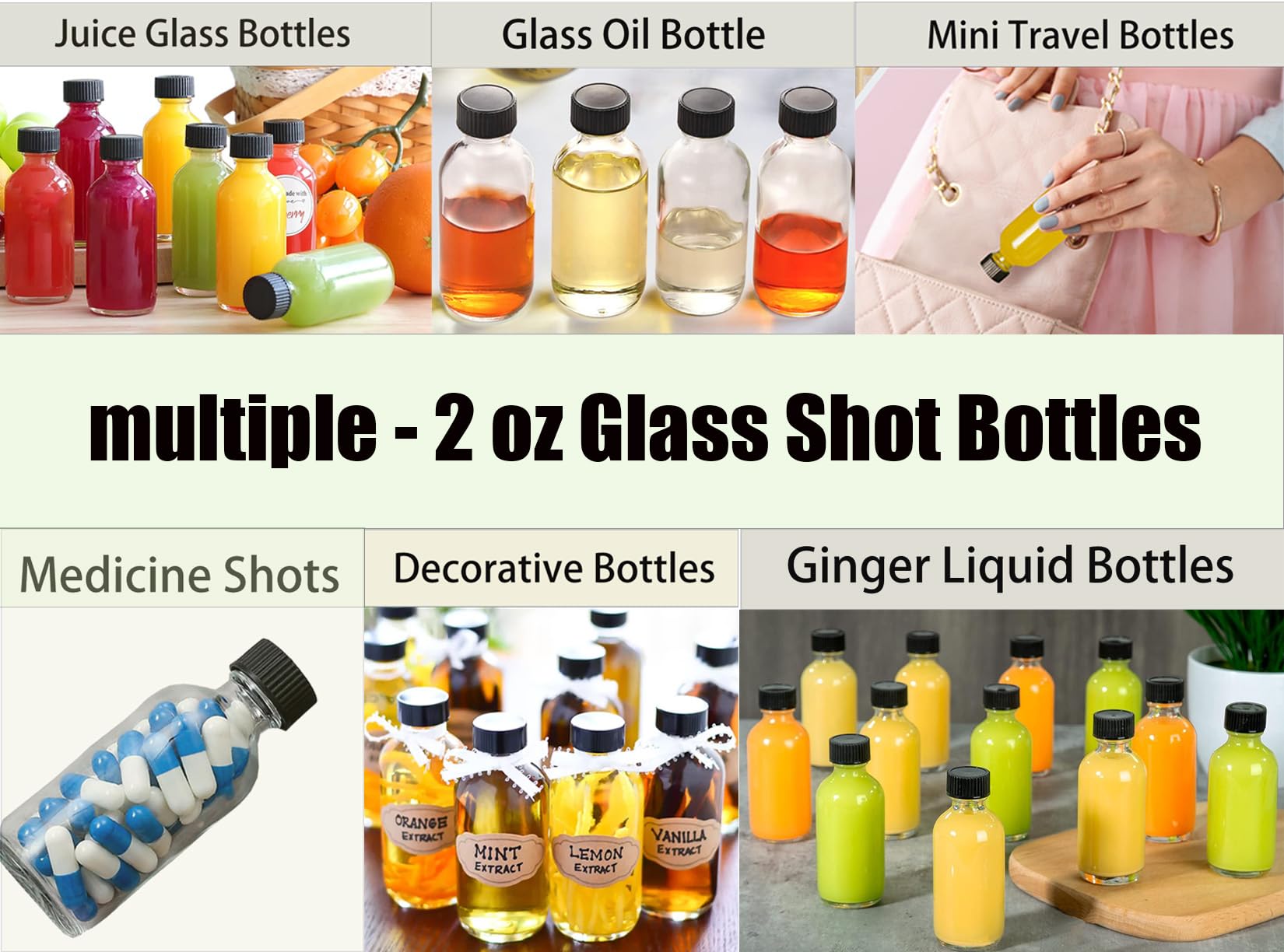 - 【Shot Bottles with Versatile Uses】These lightweight but durable shot bottles can be used as spice jars, juice bottles, health shots, ginger turmeric shots, airline bottles, small colored sand bottles, wedding decorative bottles , laboratory reagent bottles. Perfect glass containers for storing juicing, ginger, wellness, potion, oil, Liquid, DIY essential oils, beverage and samples, syrup, salad dressings, seasonings, and other kinds of foods or seeds.