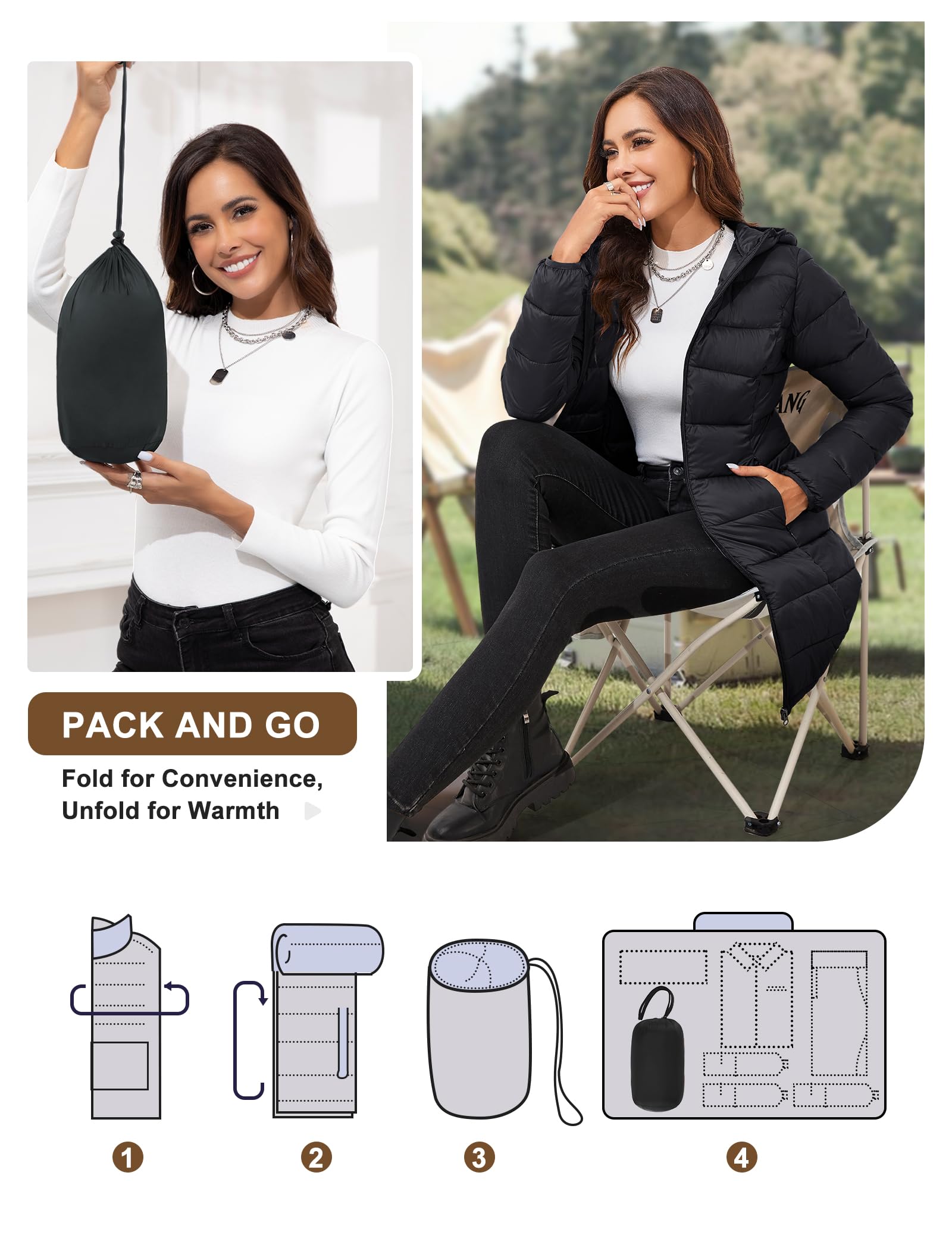 - PACKABLE: Easily pack the lightweight puffer jacket into the matching drawstring travel pouch. The packable design and stylish look make the jacket perfect for casual occasions and outdoor activities.