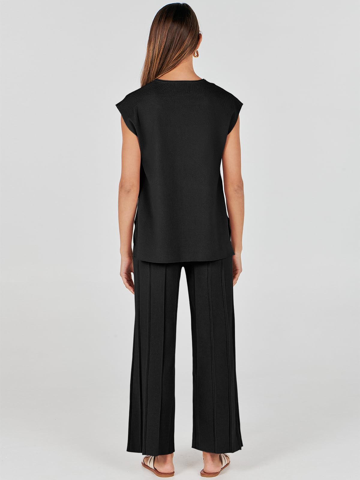 ANRABESS Women 2 Piece Outfits Casual Summer Sleeveless Tops Knit Pants Sweater Lounge Matching Sets 2024 Trendy Clothes Black Medium