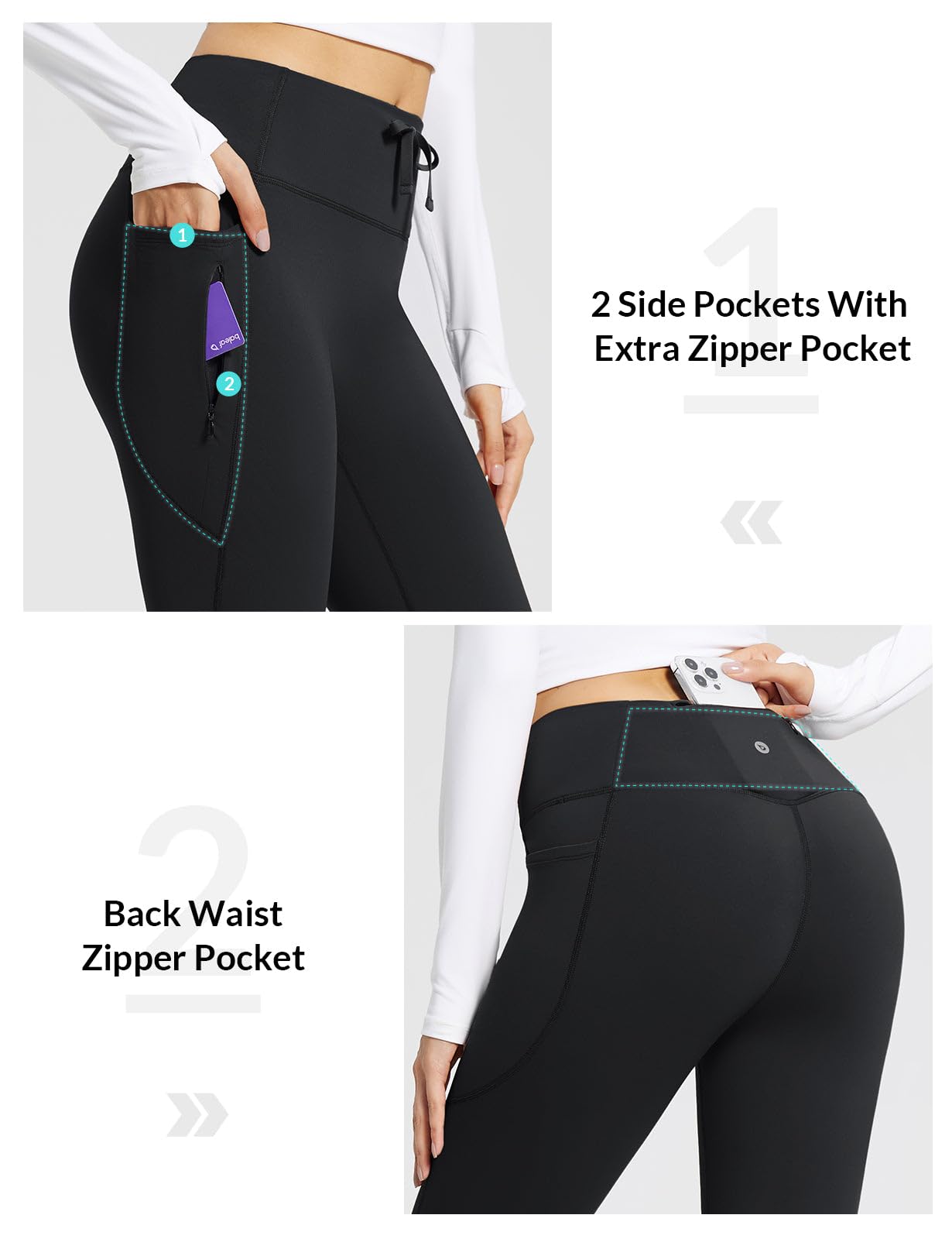 - 4 Functional Pockets: Deep side pockets available for 6.7" mobile phone, side zipper pocket can store some keys or cards, and back waist zip pocket, you can even put headband, hair clip, scrunchie, convenient for going out or workout. Free your hands in cold weather.