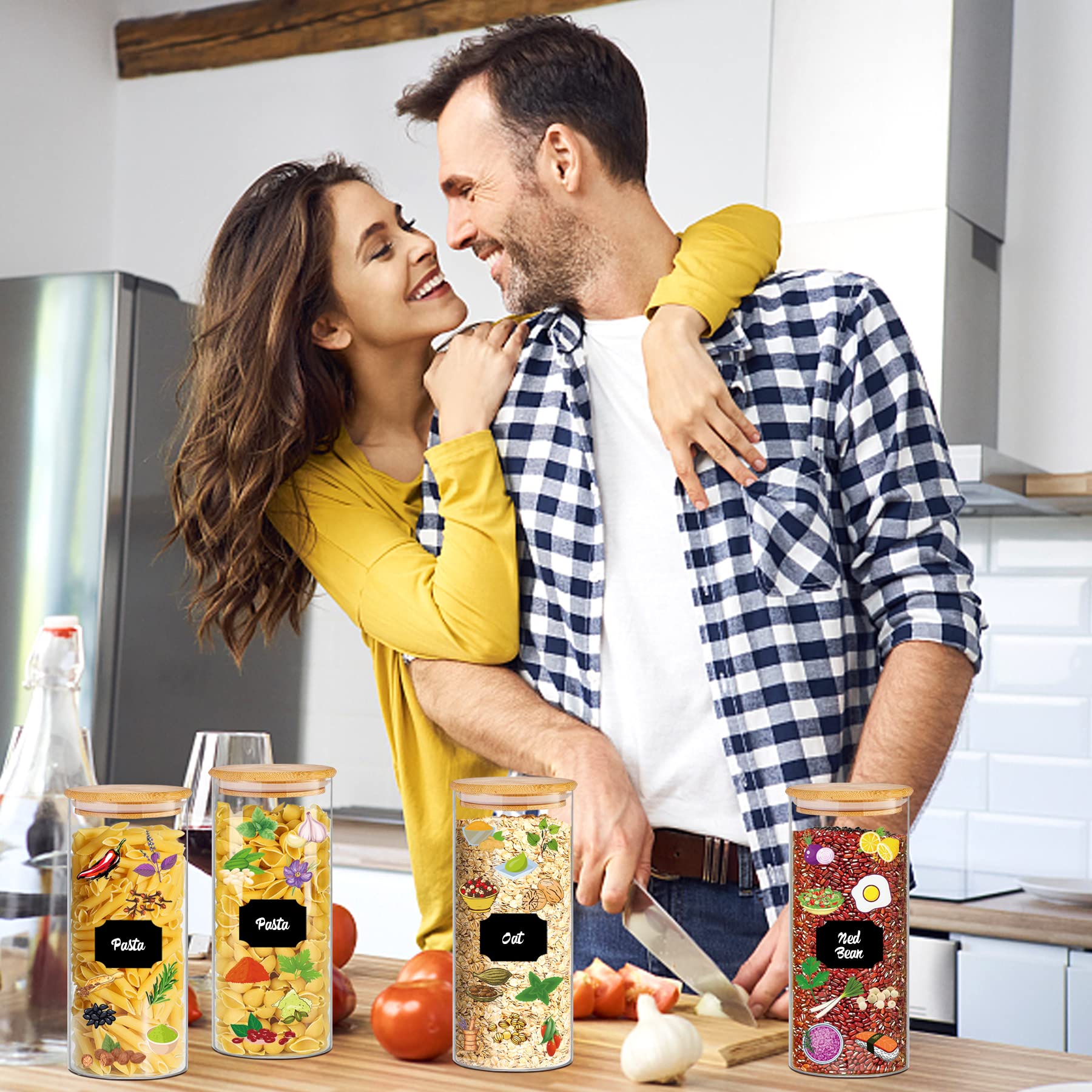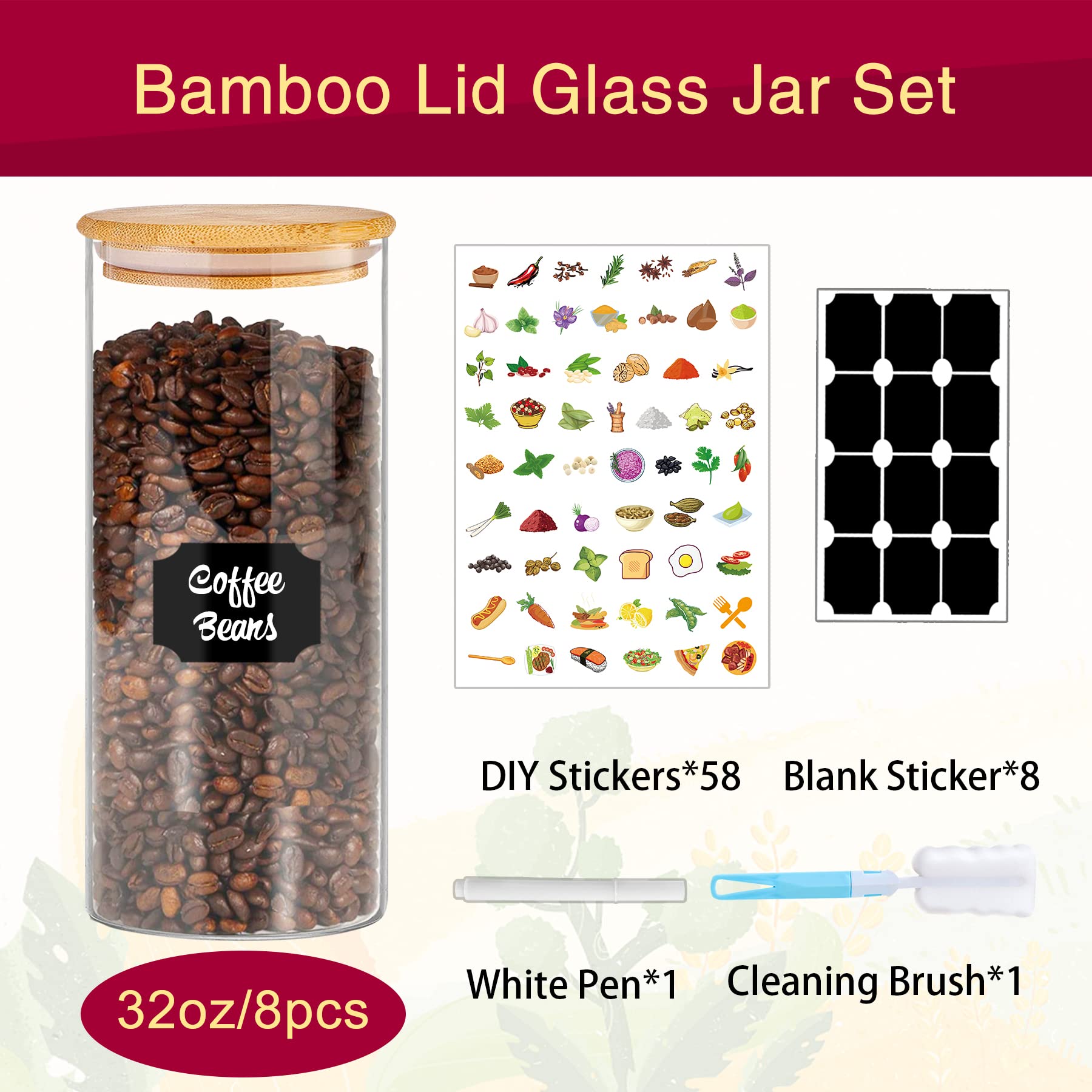 - 【Value Glass Bamboo Jars Set】: You'll get 8 neat 32 oz glass jars with bamboo lids, 58 cute colorful stickers pre-printed, 8 blank stickers you can design yourself (complete with 1 white pen), and 1 cleaning brush, making you gain the most for the least amount of money. The size of the pantry jars is 3.45 inches * 8.1 inches, which can store many things. At the same time, we use thickened cardboard boxes and sponge packaging glass jars with bamboo lids, to give you a happy shopping experience.
