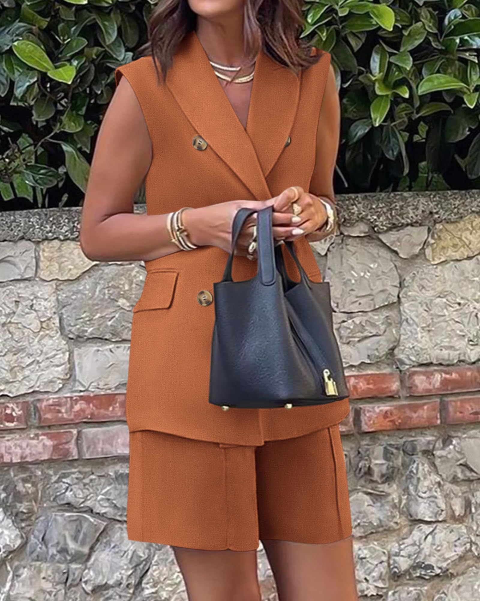 - DESIGNS: The Sleeveless Blazer Features Notched Lapel, 2 Flap Pockets And Double-breasted Design, Slim Fit Cut Highlights The Graceful Figure, Creates a Perfect Stylish Look. The High Waisted Shorts with 2 Side Pockets Shows Your Pretty Legs.