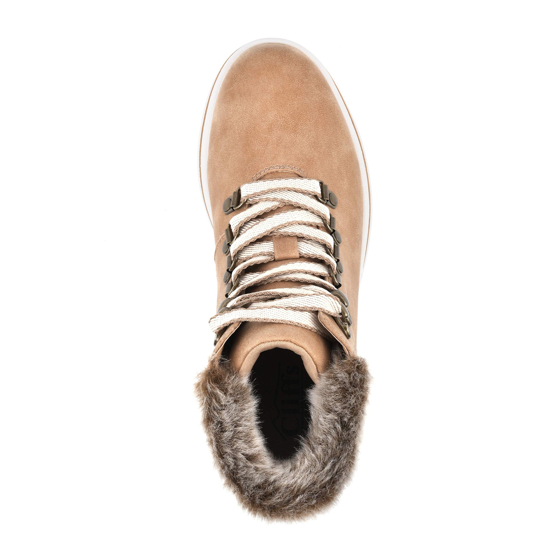 A wintery-take on a hiking boot, the Hallet bootie from Cliffs by White Mountain keeps a classic hiker style and pairs it with a modern white athletic inspired bottom. This boot has a faux fur ankle cuff to keep you warm, get you where you need to go and is nice and light on your feet.
