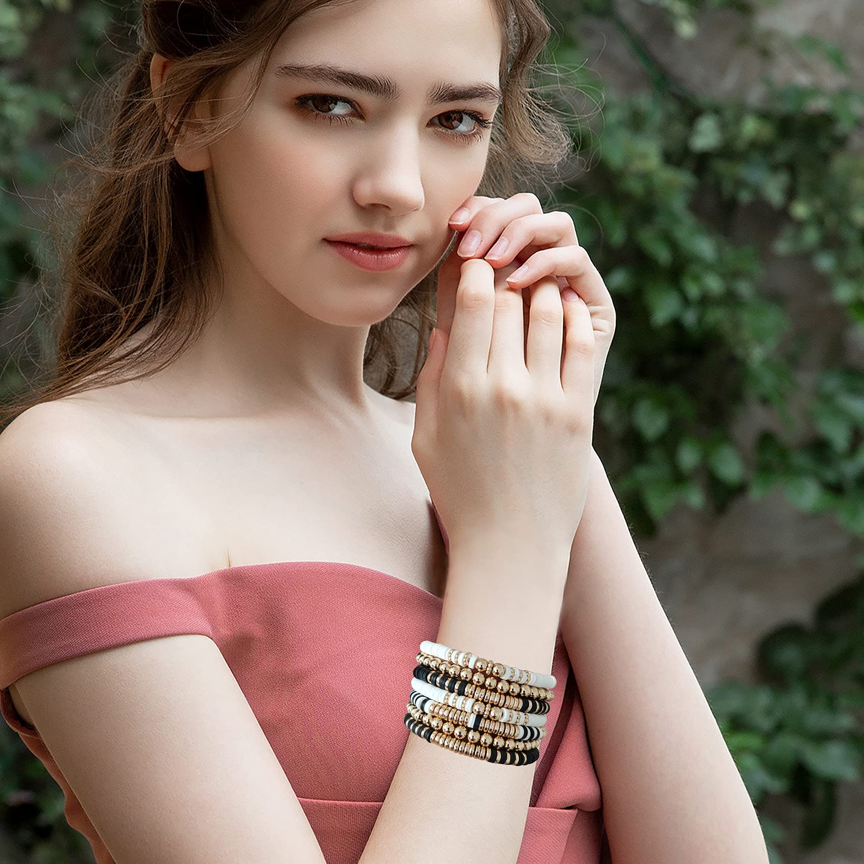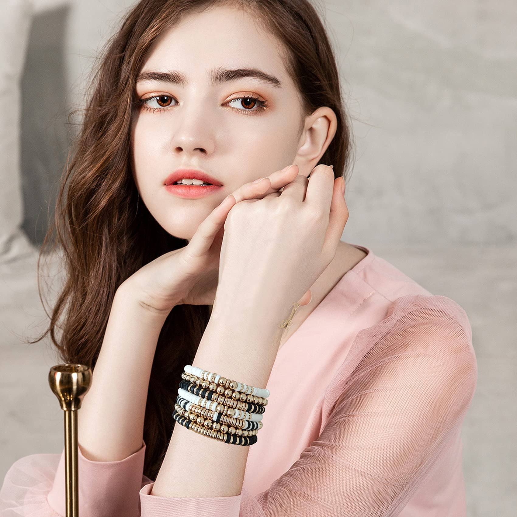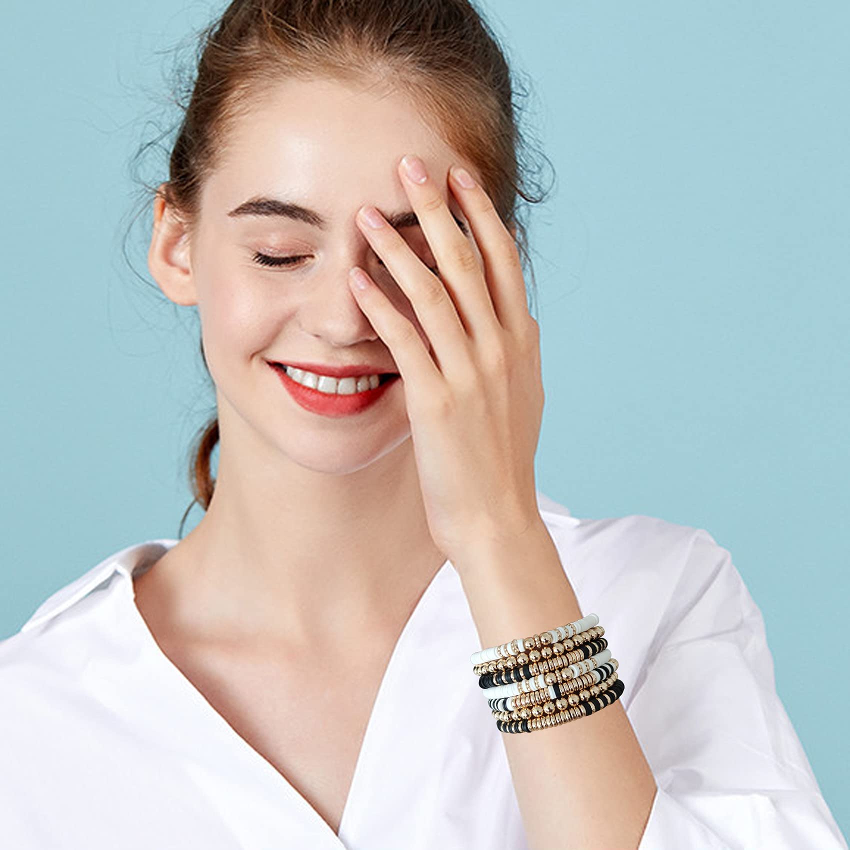 - Colorful Heishi Bracelets Set: For beach jewelry, aesthetic stuff Bracelets Jewelry we love a mix color of effortless layering bracelets. Bold and vibrant, the Bohemia bracelets are consist of flat clay beads and gold plated sequins on elastic bands.One package including 7 strands of heishi bead and gold bead bracelet, playful, colorful and stretch.