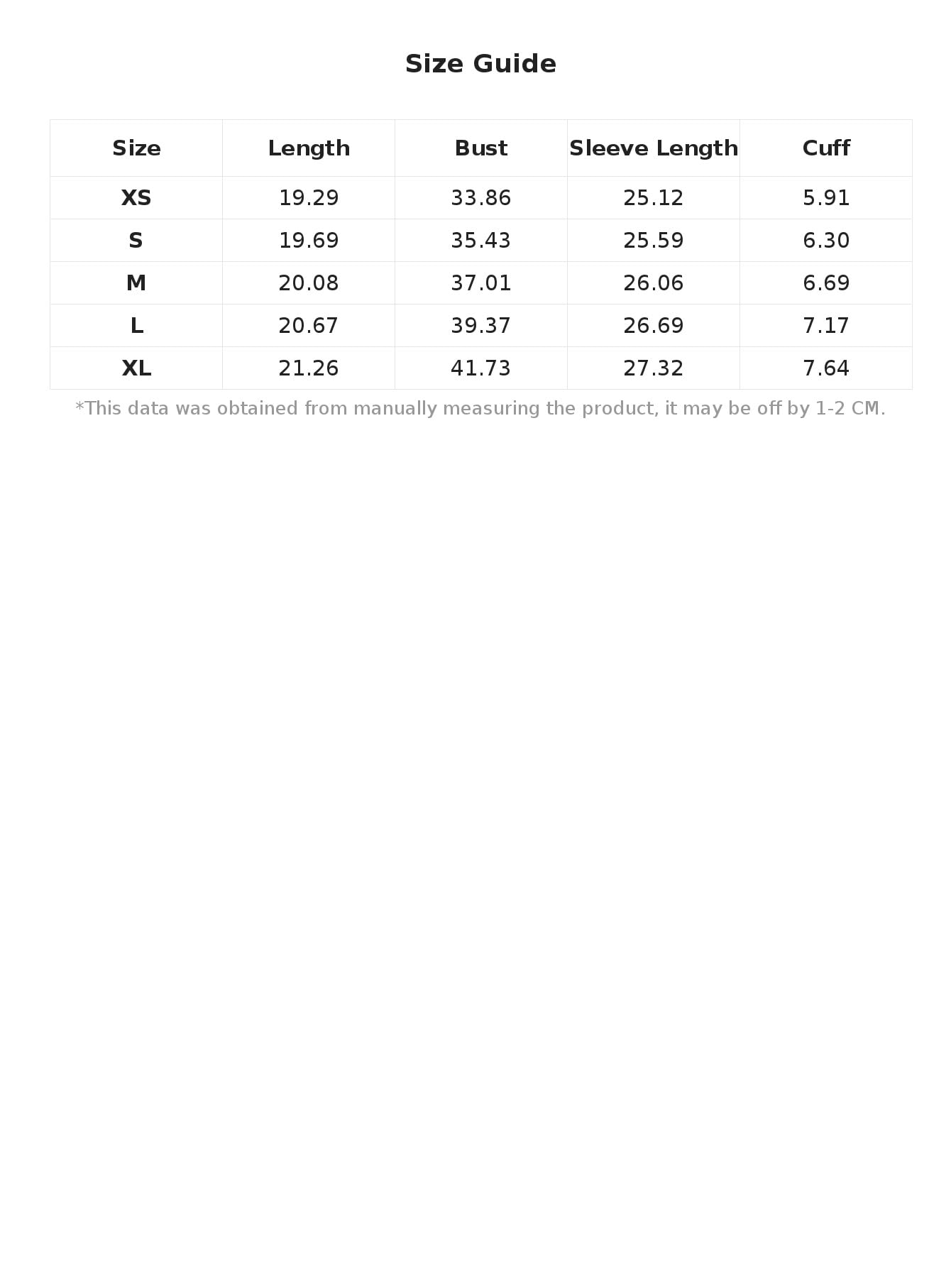 S: Bust: 35.4", Cuff: 6.3", Length: 19.7", Sleeve Length: 25.6"