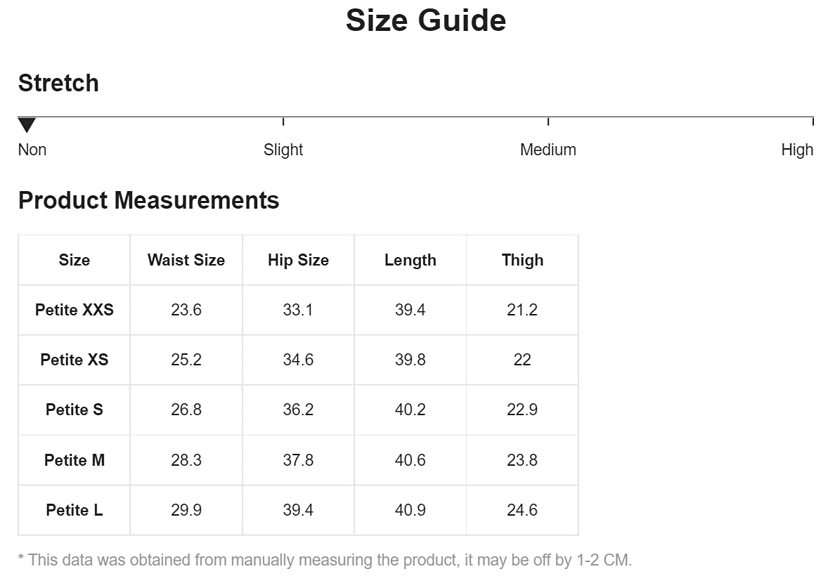 XX-Small: Hip Size: 33.1", Length: 39.4", Thigh: 21.2", Waist Size: 23.6"