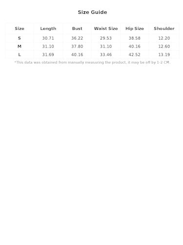 S:Bust:36.2IN,Hip Size:38.6IN,Length:30.7IN,Shoulder:12.2IN,Waist Size:29.5IN