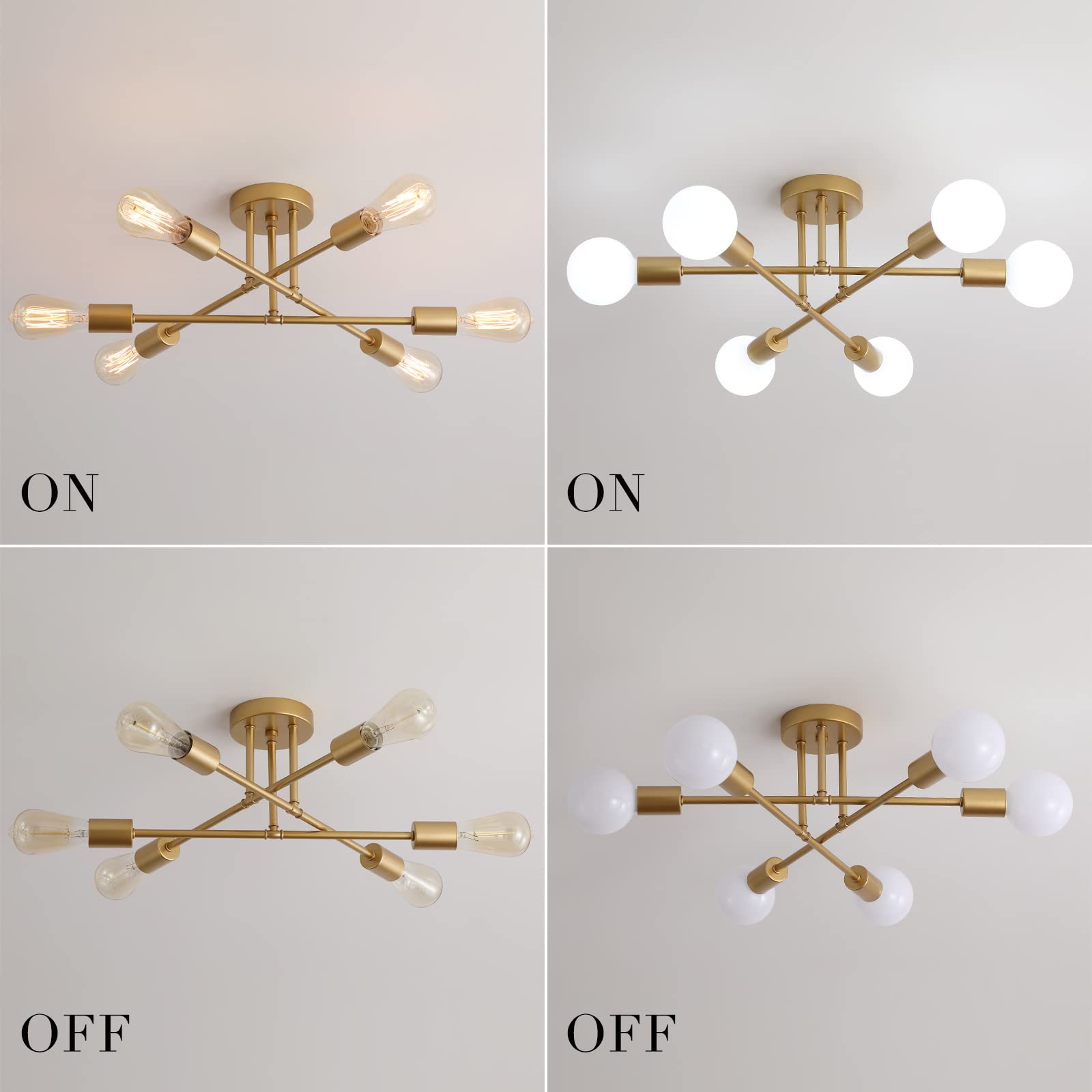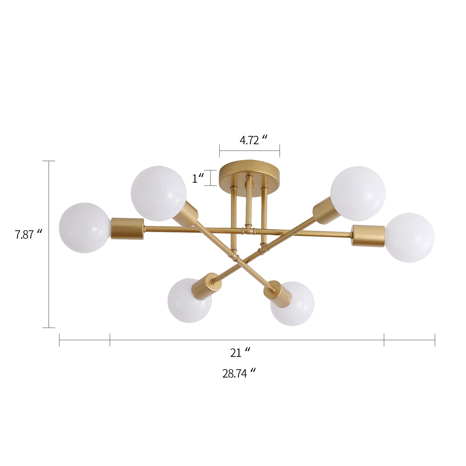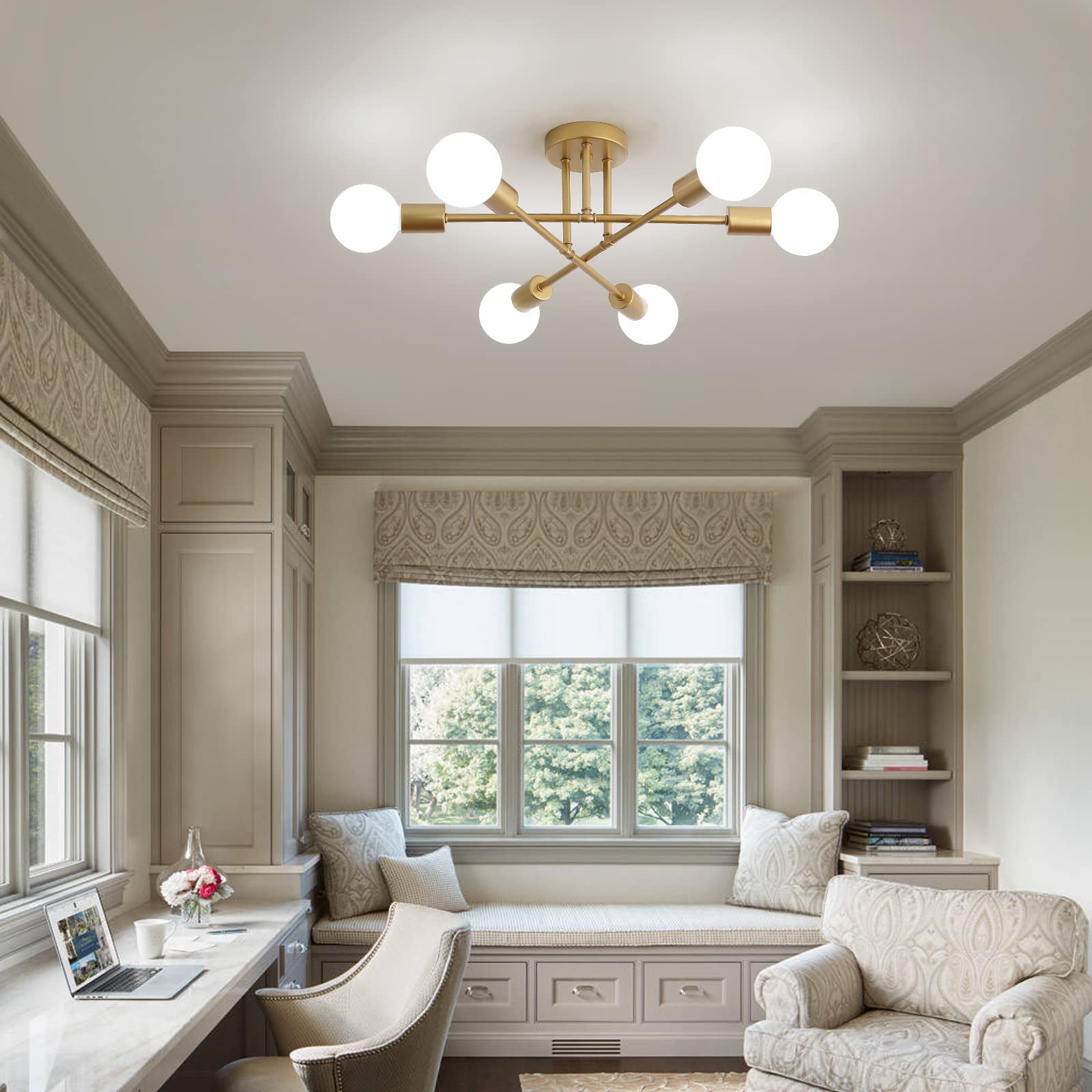 MEIXISUE Gold Modern Sputnik Chandelier Ceiling Light Fixtures,6-Lights Industrial Metal Semi Flush Mount Ceiling Light for Bedroom Dining Room Living Room Kitchen Hallway UL Listed