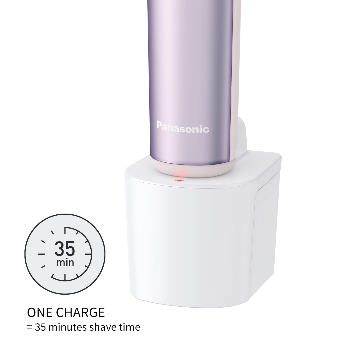 Details: Enjoy a safe, gentle shave with the Panasonic Shaver for women ES-AWL8AV. Four ultra-sharp floating blades and outer foils hug your curves, for a silky-smooth, close shave. And, blades are made of hypoallergenic stainless steel for less irritation, even on sensitive skin. The unique blade design allow you to shave backwards or forwards, to cover large areas more quickly. A pop-up womens bikini trimmer lets you shape and trim even your most sensitive areas precisely and gently, while the bikini comb attachment lets you keep hair at a desired length. With this waterproof womens shaver you can shave and trim in or out of the shower, with an ergonomic handle that is easy to use even when wet; it comes with a full range of accessories, such as a travel pouch, trimming comb, and brush. And, a neat charging stand eliminates messy charging cords. A full charge provides up to 35 minutes of use.