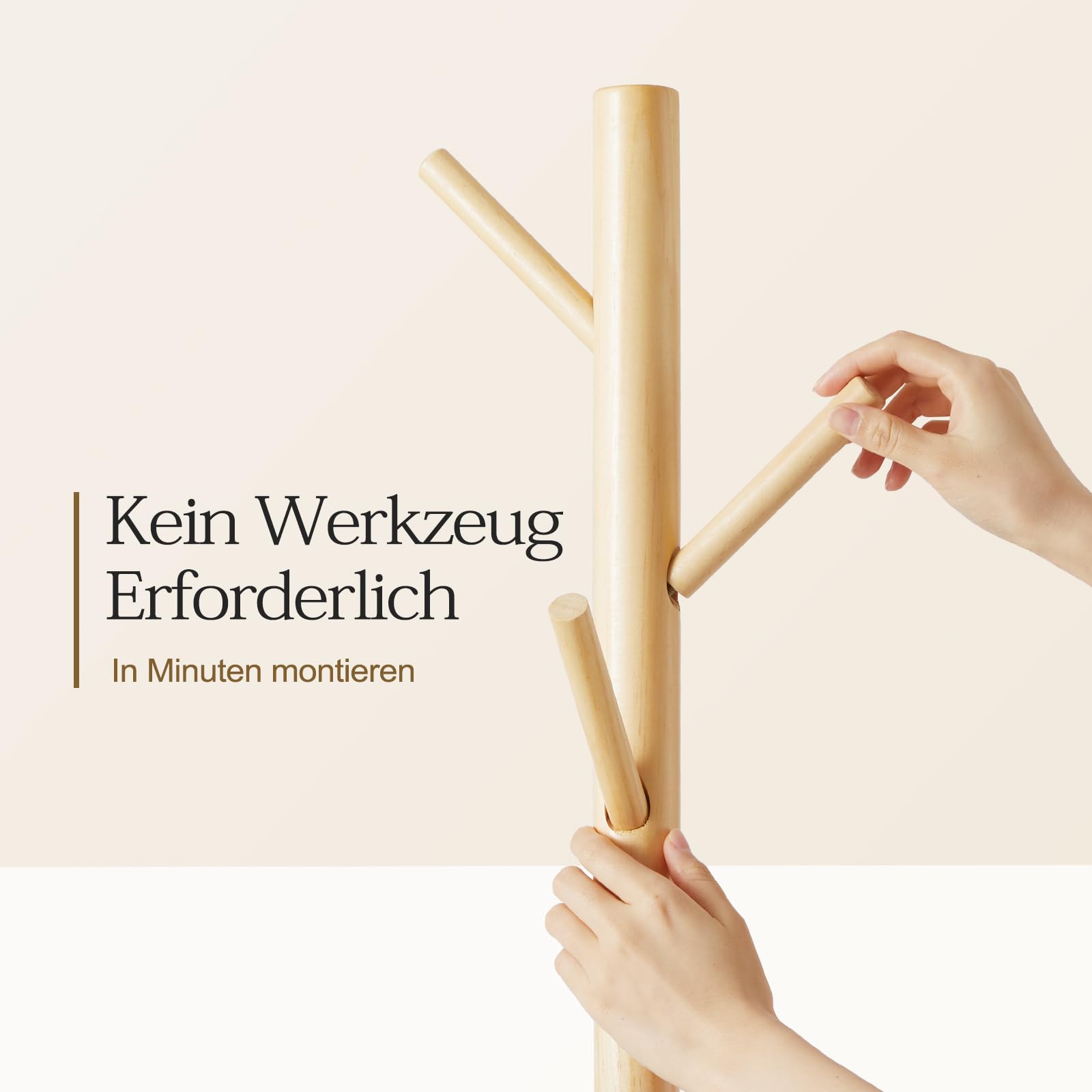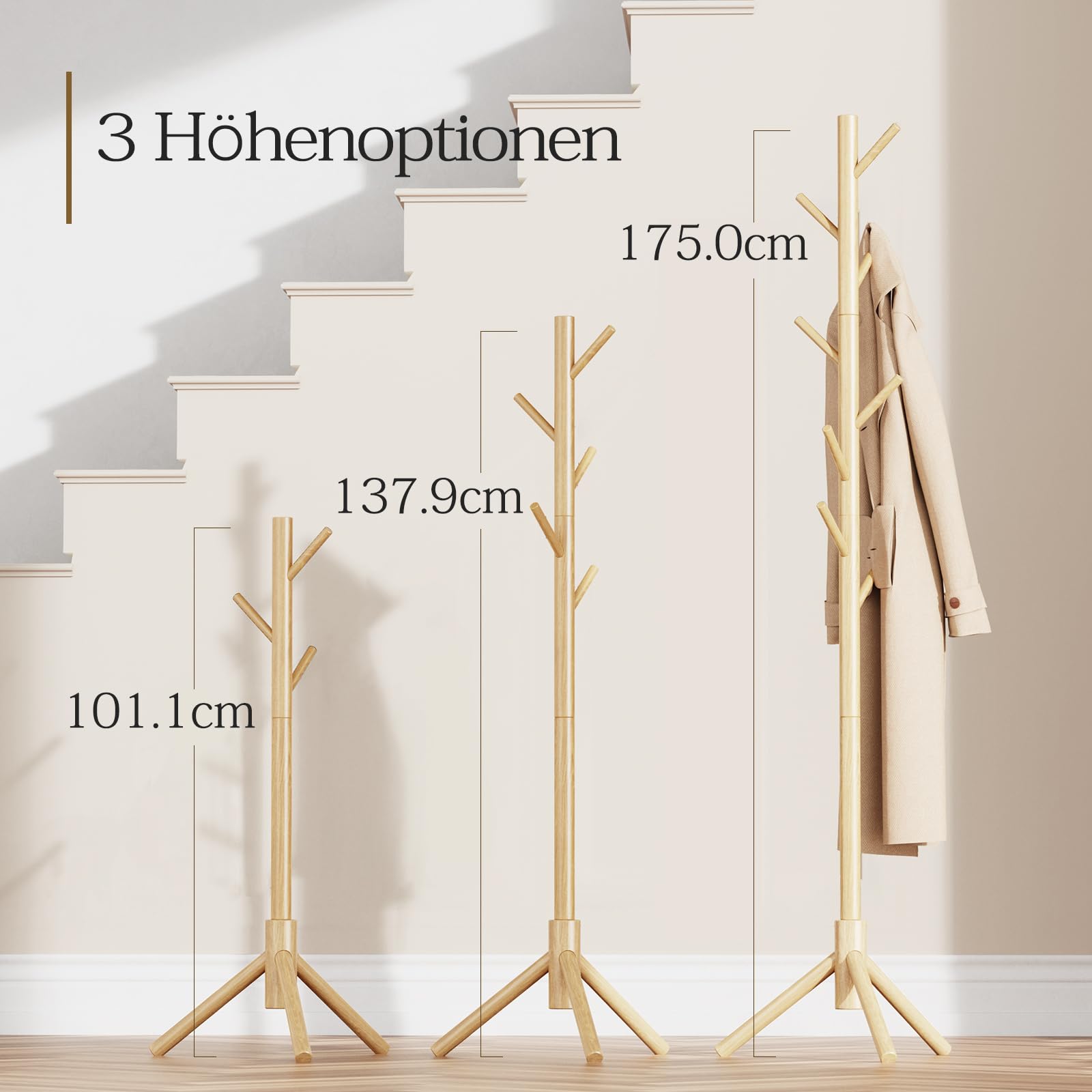 Pipishell Coat Rack Sturdy Wooden Coat Rack Stand, Adjustable Coat Tree, Free Standing Tree Hanger with 4 Sections & 8 Hooks, for Home/Bedroom/Office/Hallway/Entryway