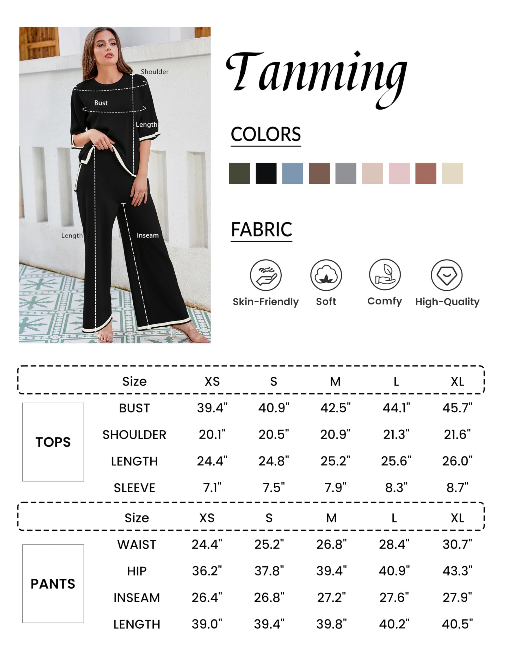 Tanming Sweater Sets Women 2 Piece Lounge Sets Short Sleeve Knit Pullover Tops Wide Leg Pants (Black-M)