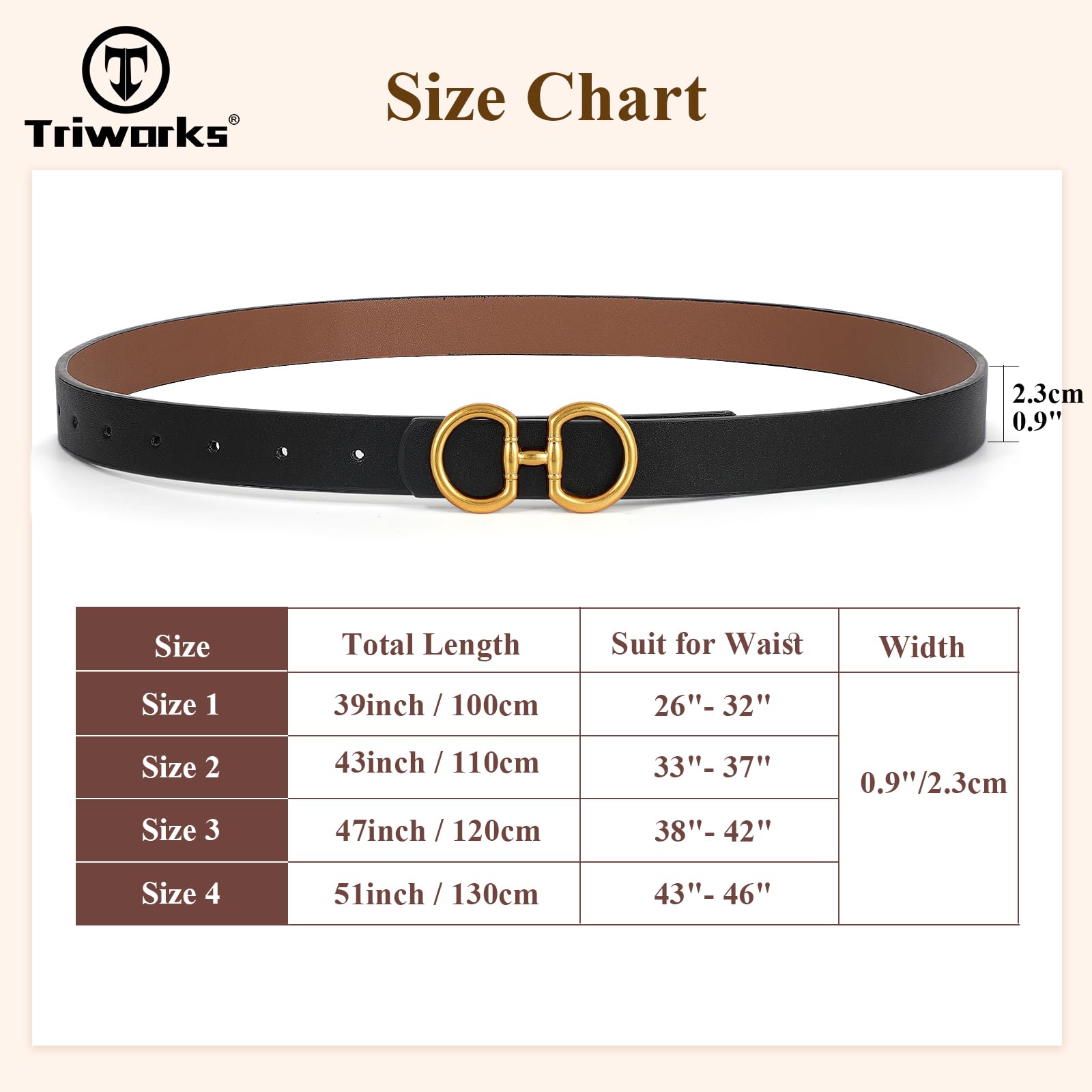 - Adjustable Size Belt - The width of this women reversible belt is 2.3cm/0.9". This women leather belt has 9 holes and an additional hole punch, there is enough room for size adjustment to fit most women. This jeans belt have 6 sizes, fits waist size from 25" to 54".