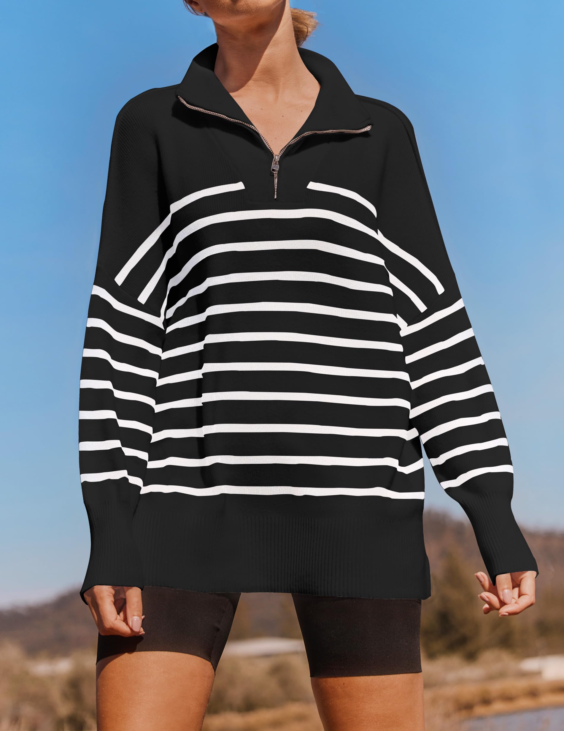 ZESICA Women's Striped Sweaters Half Zipper Long Sleeve Ribbed Knit Loose Oversized Pullover Sweater Tops,Black,Medium